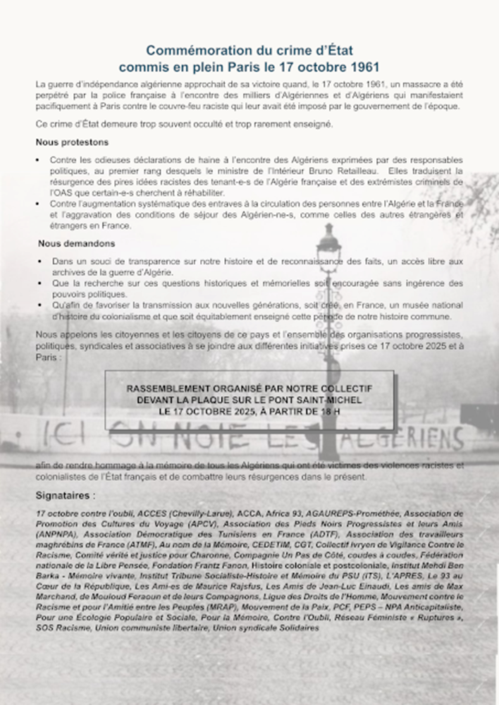 17 octobre contre l’oubli, ACCES (Chevilly-Larue), ACCA, AFPS Paris-Sud, Africa 93, AGAUREPS-Prométhée, AMFPGN, AMF, APAREDESA, Apel-Égalité, Association de Promotion des Cultures du Voyage (APCV), Association des Médecins pour la Prévention de la Guerre Nucléaire (AMPGN), Association des Pieds Noirs Progressistes et leurs Amis (ANPNPA), Association Démocratique des Tunisiens en France (ADTF), ASTI de Colombes, ATTAC France, ATMF, Au nom de la Mémoire, CEDETIM, CGT, CISE, CISPM, Collectif Boycott Apartheid Israël Paris-Banlieue, Collectif Faty KOUMBA, Collectif Ivryen de Vigilance Contre le Racisme, collectif Sövkipeu, Collectif Unitaire Franco-Algérien de l’Île de France, Comité vérité et justice pour Charonne, Compagnie Un Pas de Côté, Coordination nationale Pas sans Nous, COPAF, coudes à coudes, CRID, DIEL, Euro Palestine, FASTI, Fédération nationale de la Libre Pensée, Fondation Frantz Fanon, FSE, FTCR, Histoire coloniale et postcoloniale, Institut Mehdi Ben Barka – Mémoire vivante, Institut Tribune Socialiste-Histoire et Mémoire du PSU (ITS), Jeunes Insoumis-es, JSJV, L’APRES, La Marche des Solidarités, Le 93 au Cœur de la République, Le Poing Levé, Les Ami-es de Maurice Rajsfus, Les Amis de Jean-Luc Einaudi, Les amis de Max Marchand – de Mouloud Feraoun et de leurs Compagnons, LDH, LDH Auxerre, LDH EHESS, Les Amoureux au ban public, Mouvement contre le Racisme et pour l’Amitié entre les Peuples (MRAP), Morlaix Libertés, Mouvement de la Paix, Mouvement des Progressistes, PCF, PEPS, NPA Anticapitaliste, Palestine Vivra !, Pour une Écologie Populaire et Sociale, Pour la Mémoire – Contre l’Oubli, Renouveau Syndical, RESOCI-Algérie-Point-com, Réseau Féministe « Ruptures », Révolution Permanente, ROSMERTA, SNPES.PJJ-FSU, Solidaires Étudiant-e-s, Solidarités Asie France, SOS Racisme, Survie, Union étudiante, UJFP, Union communiste libertaire, Union syndicale Solidaires,…